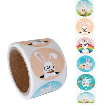 Ozdób wielkanocne prezenty, kartki, koperty i opakowania wyjątkowymi naklejkami z uroczymi króliczkami! Ta rolka zawiera aż 100 naklejek o średnicy 2,5 cm, przedstawiających różnorodne, kolorowe motywy związane z Wielkanocą – króliczki w okularach, w jajkach, na tęczy i w otoczeniu pisanek. Idealne do dekoracji, scrapbookingu, pakowania upominków i prac plastycznych z dziećmi.