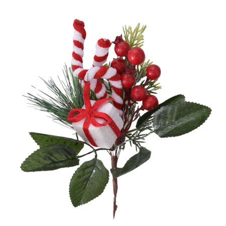 - Gałązka świąteczna 20 cm z prezentem, KULKAMI, igliwiem i lizakami – idealna do stroików, choinek i dekoracji bożonarodzeniowych.