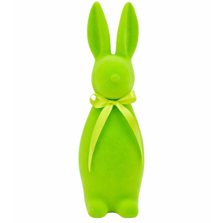 • Zajączek wielkanocny 31x9 cm w kolorze zielonym z kokardką – stylowa ozdoba na Wielkanoc i do wiosennych dekoracji wnętrz.