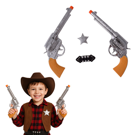 - Kompletny zestaw: Dwa pistolety, gwiazda szeryfa i naboje do pasa sprawiają, że dziecko może od razu wcielić się w postać kowboja lub szeryfa.